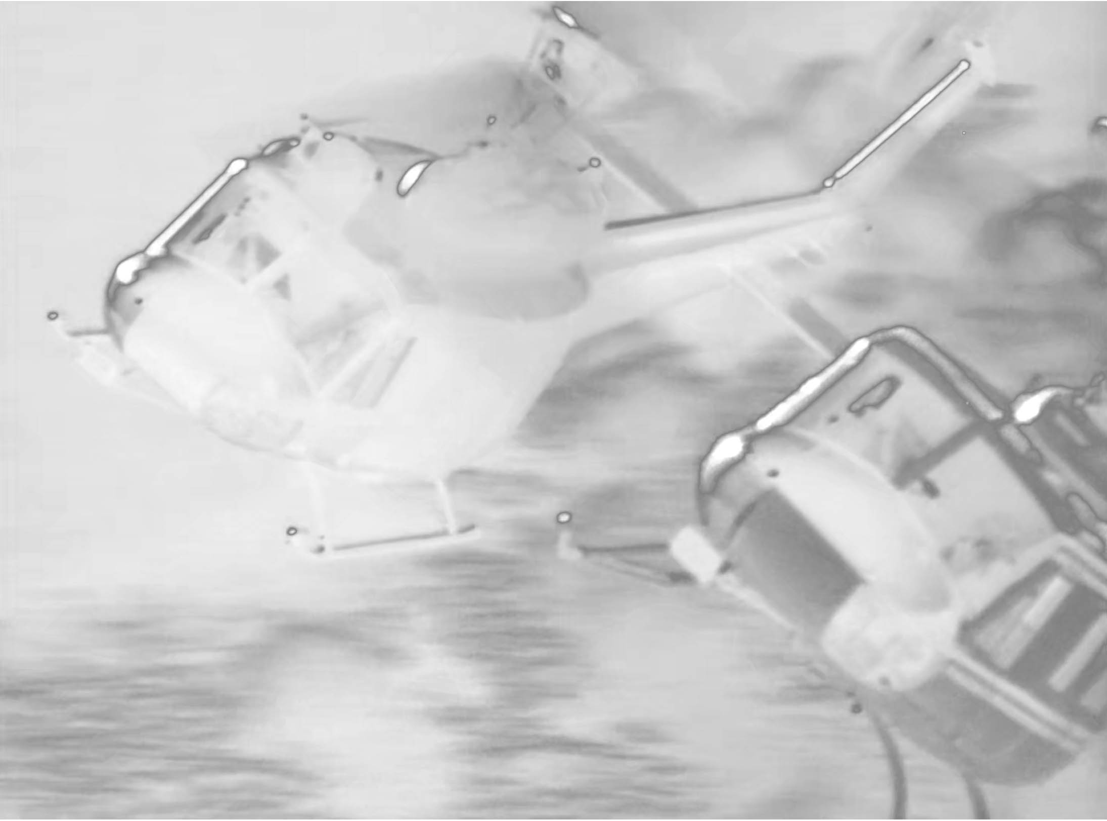 degrés quand il a soudainement semblé mettre ses rotors à l’horizontale et a immédiatement percuté le flanc de la colline, rebondissant en l’airsur environ 10 pieds, se brisant en deux, avec la partie cabine qui a basculé à l’envers et atterri dans cette position. Cette activité s’est déroulée en ligne droite à environ 400 mètres de la position de la caméra, où