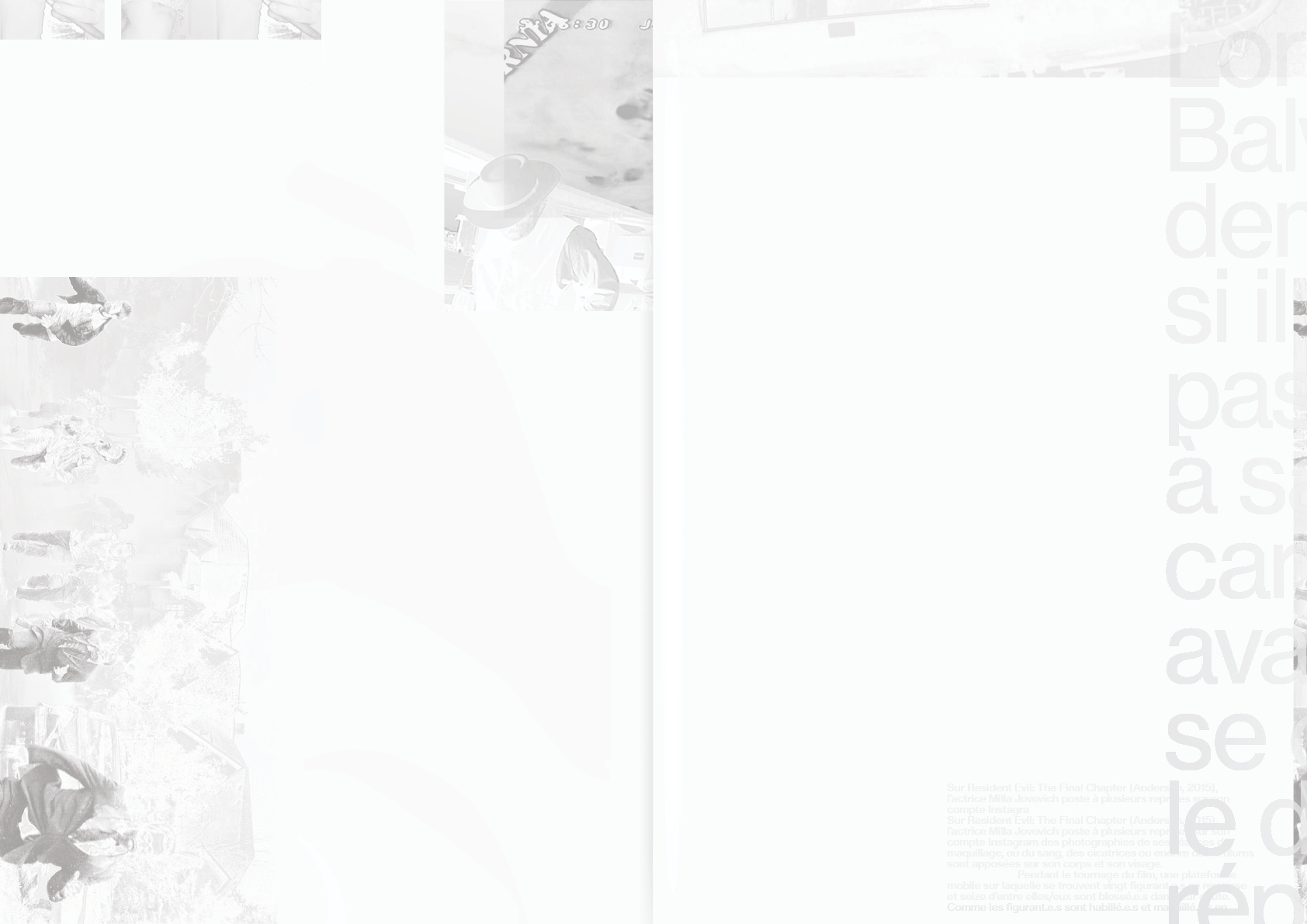 Sur Resident Evil: The Final Chapter (Anderson, 2015), l’actrice Milla Jovovich poste à plusieurs reprises sur son compte Instagram des photographies de ses séances de maquillage, où du sang, des cicatrices ou encore des brûlures sont