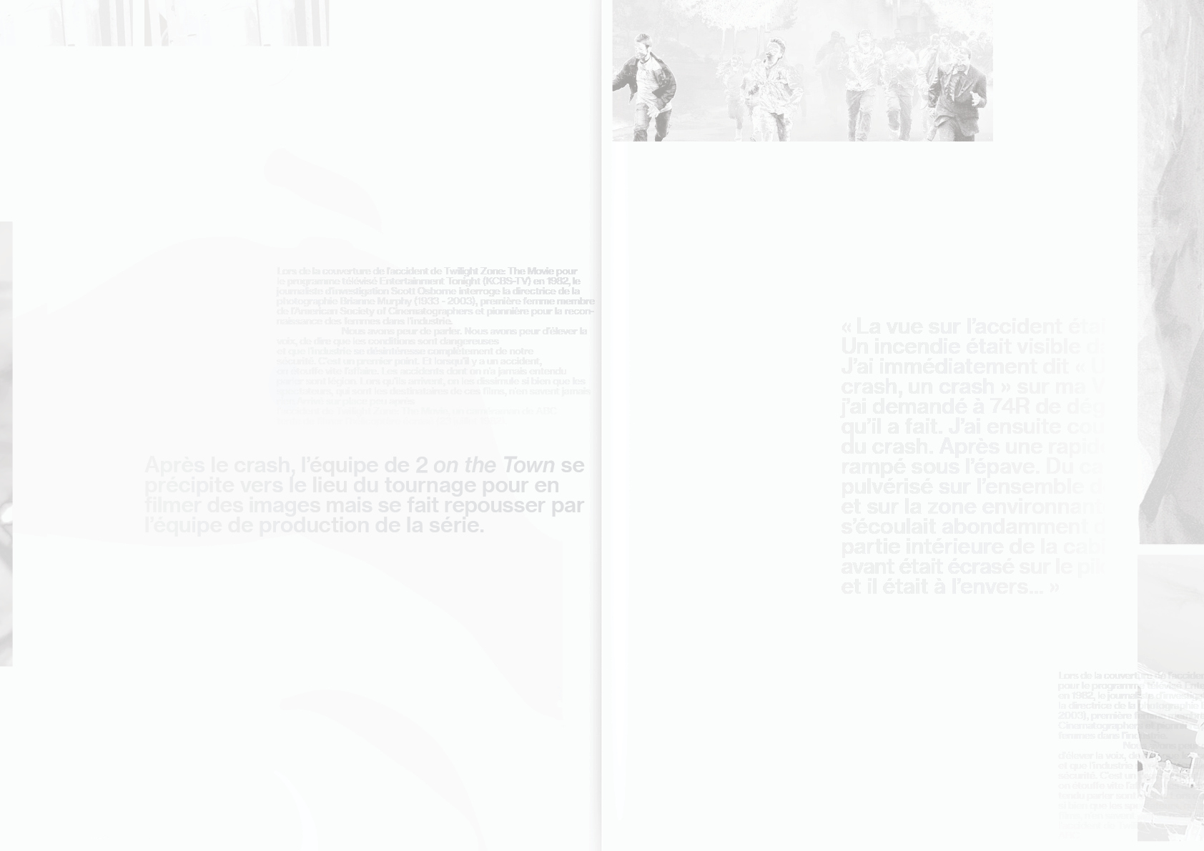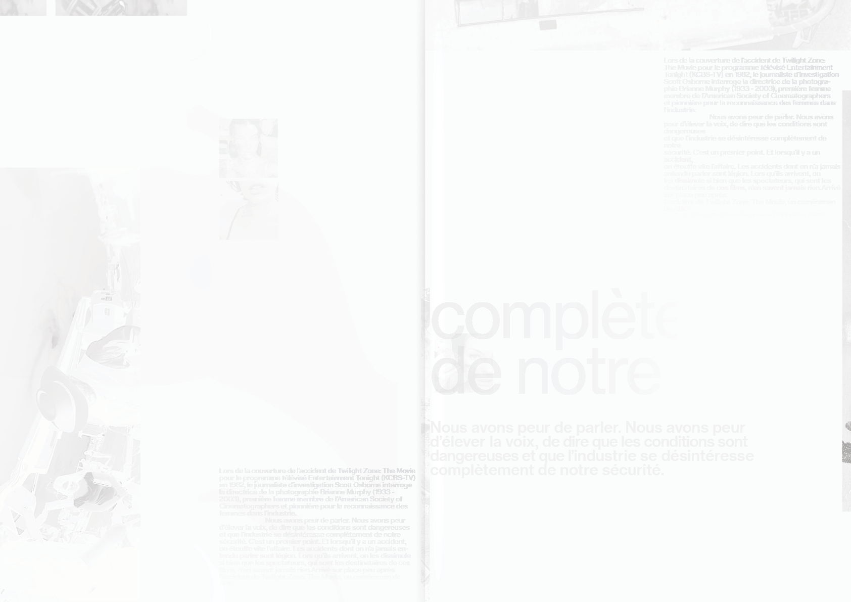 Lors de la couverture de l’accident de Twilight Zone: The Movie pour le programme télévisé Entertainment Tonight (KCBS-TV) en 1982, le journaliste d’investigation Scott Osborne interroge la directrice de la photographie Brianne Murphy (1933 - 2003), première femme membre de l’American Society of Cinematographers et pionnière pour la reconnaissance des femmes dans l’industrie. Nous avons peur de parler. Nous avons peur d’élever la voix, de dire que les conditions sont dangereuses et que l’industrie se désintéresse complètement de notre sécurité. C’est un premier point. Et lorsqu’il y a un accident, on étouffe vite l’affaire. Les accidents dont on n’a jamais entendu parler sont légion. Lors qu’ils arrivent, on les dissimule si bien que les spectateurs, qui sont les destinataires de ces films, n’en savent jamais rien.