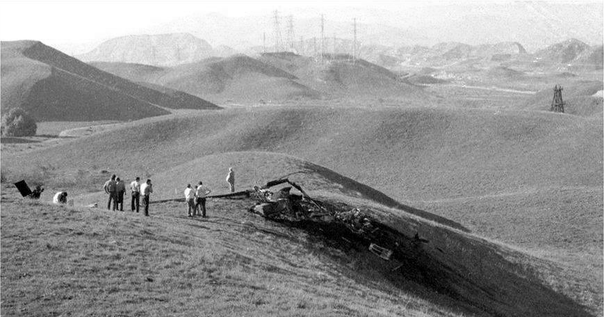 Arrivé sur place peu après l’accident de Twilight Zone: The Movie, un caméraman de ABC tente de filmer l’hélicoptère écrasé (23 juillet 1982).