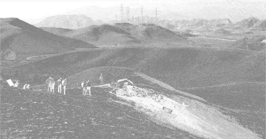 Photographie de Peppertree Canyon le lendemain de l’accident, le 19 janvier 1985. Publiée sur le groupe Facebook The Airwolf Guidebook, Episode Study : Natural Born and the Real-life Huey Crash